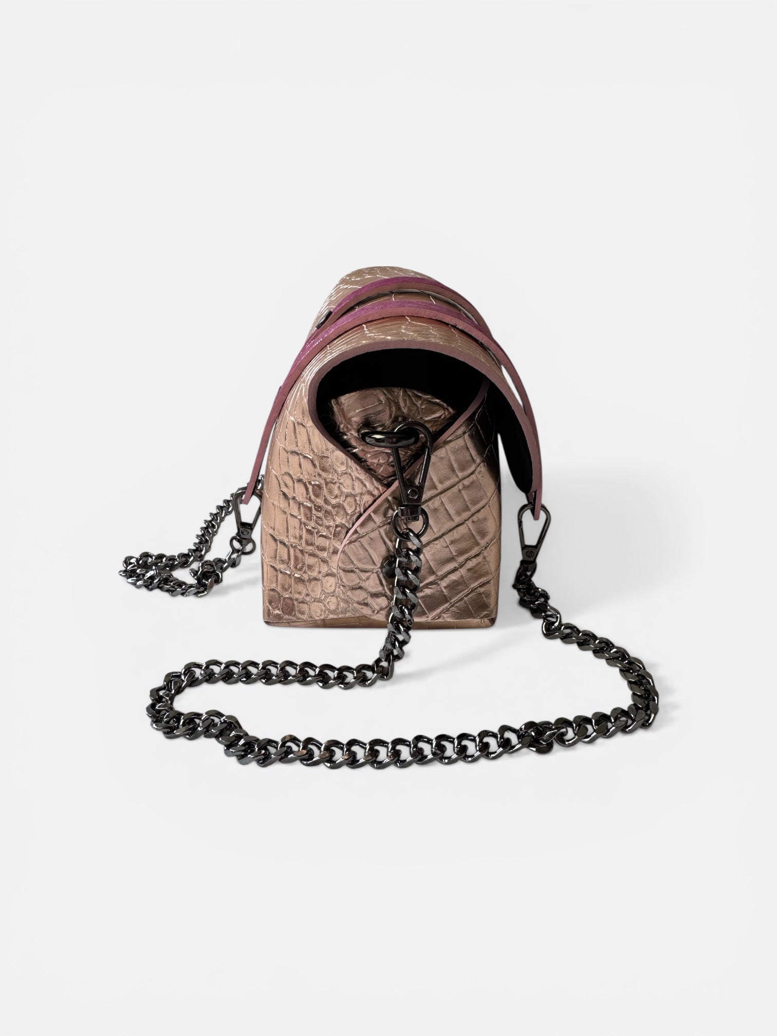 En cuir métallisé croco champagne rosé , chèvre laminé , languette en cuir laminé léopard irisé rose , cuir de chèvre métallisé sur base en daim rose .
