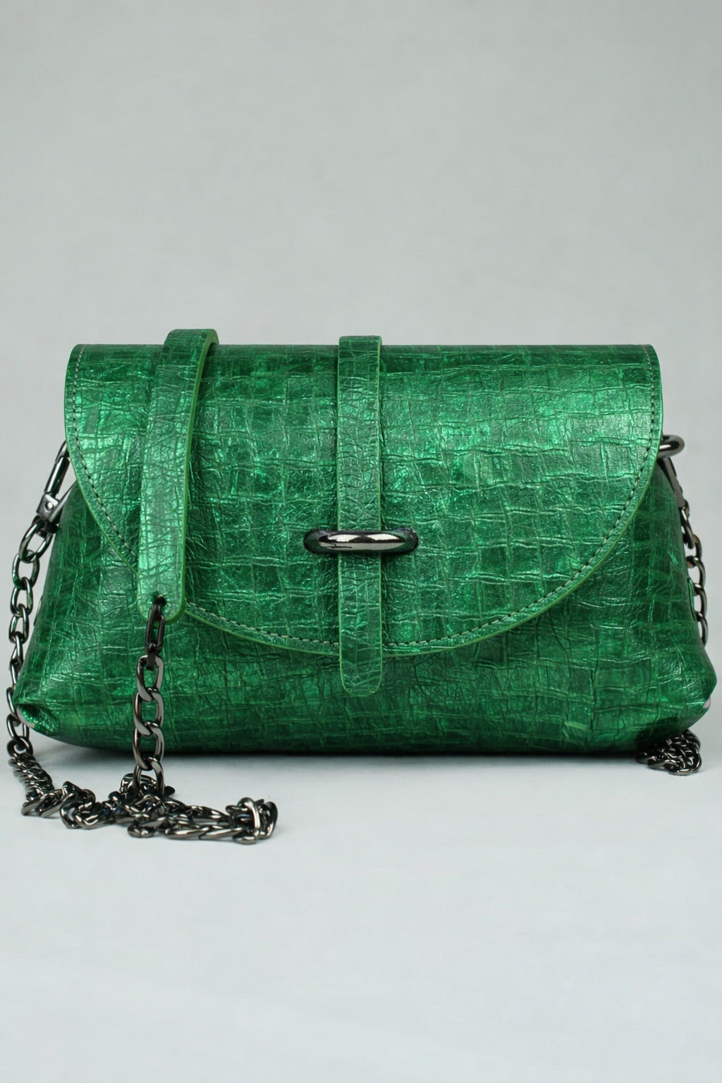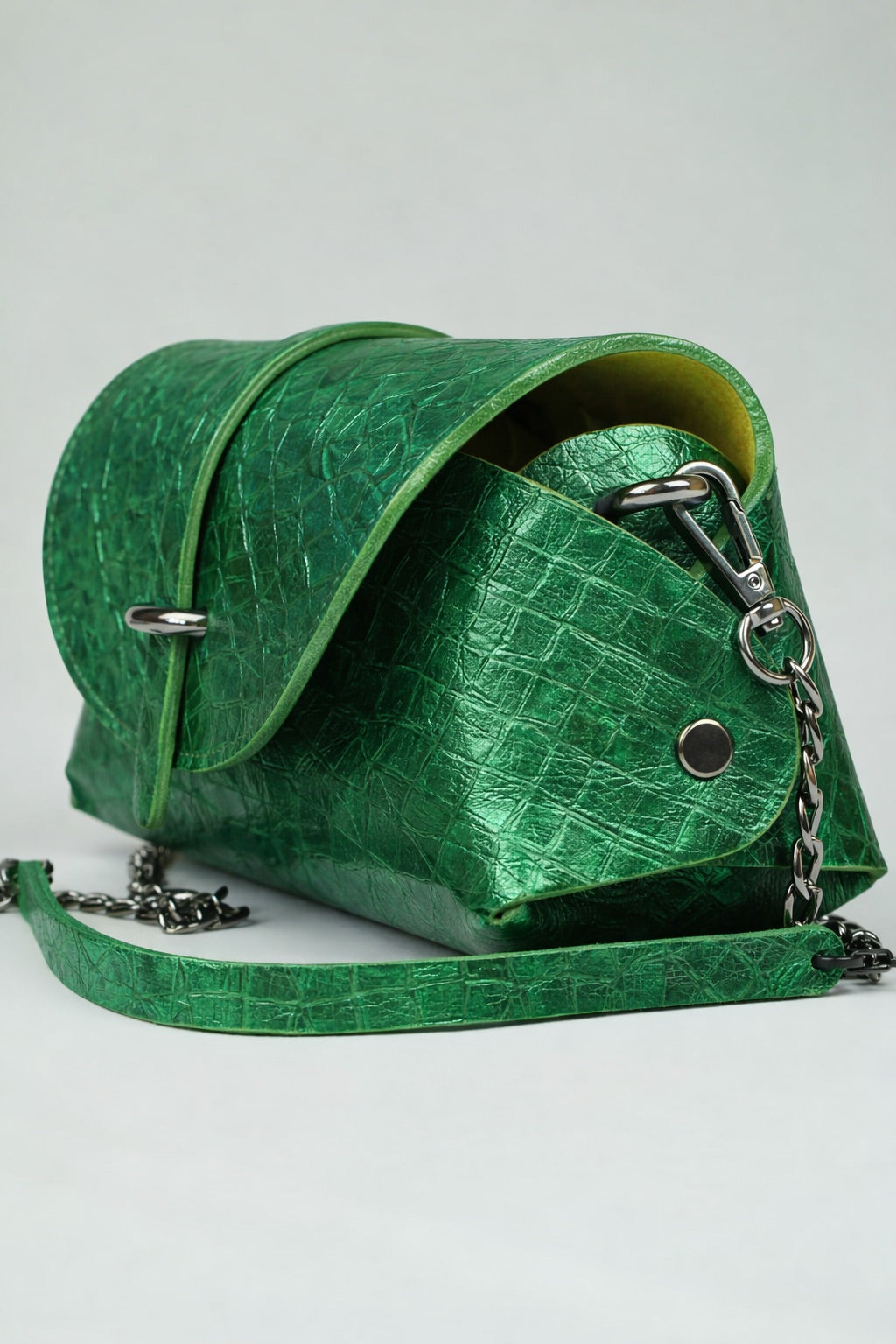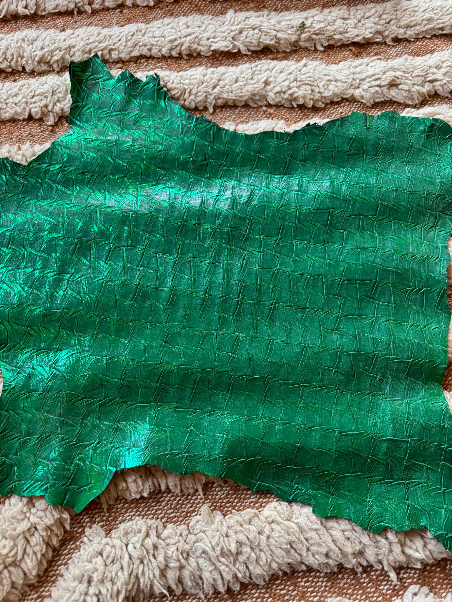 En cuir de veau irisé métallisé vert , tout en relief , martelé , graphique holographique