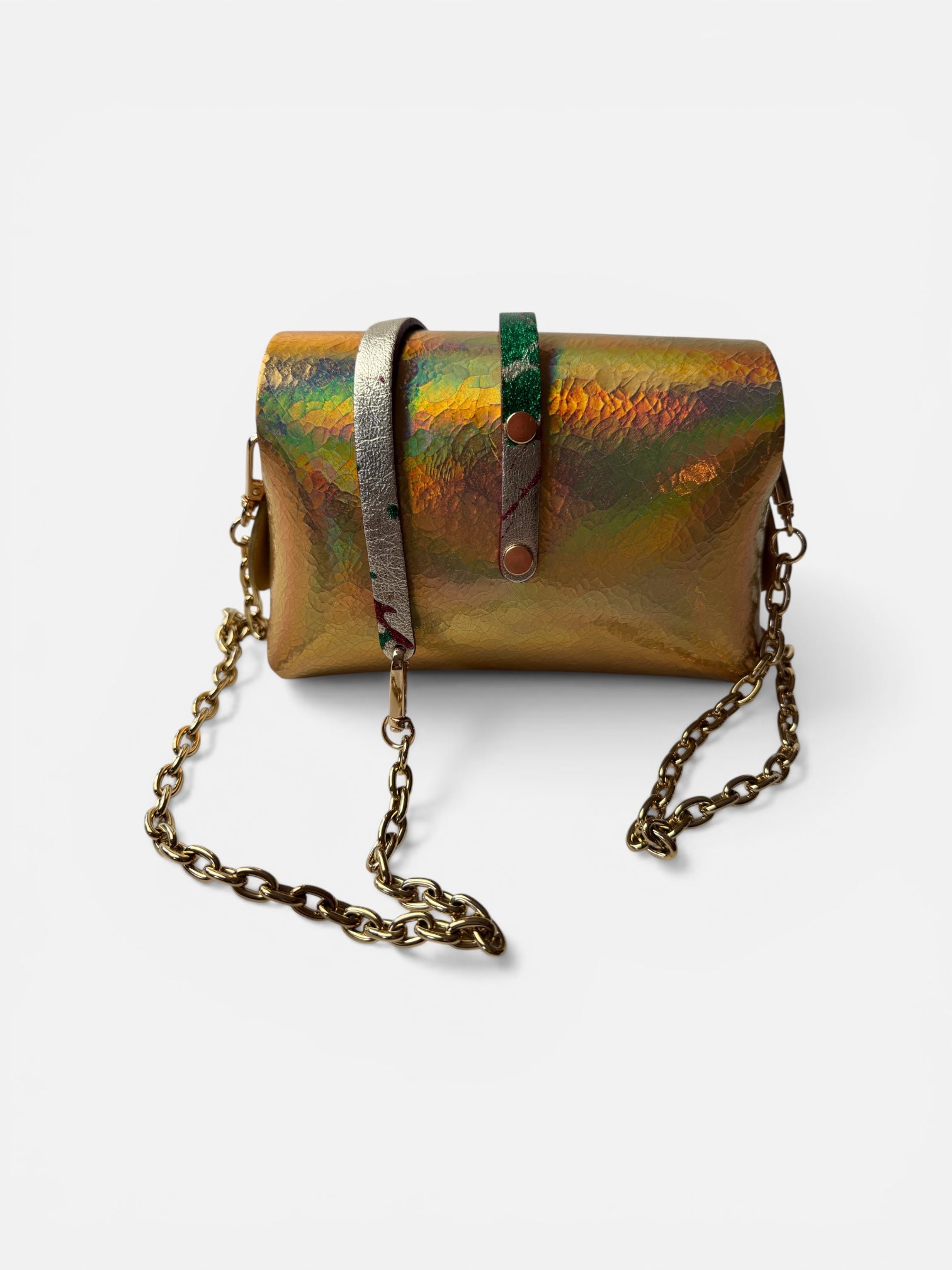 En cuir Italien, veau velours cuir irisé holographique , brillant , multicolore , reflet qui change avec la lumière et le soleil , languette chèvre lamine peinte à la main