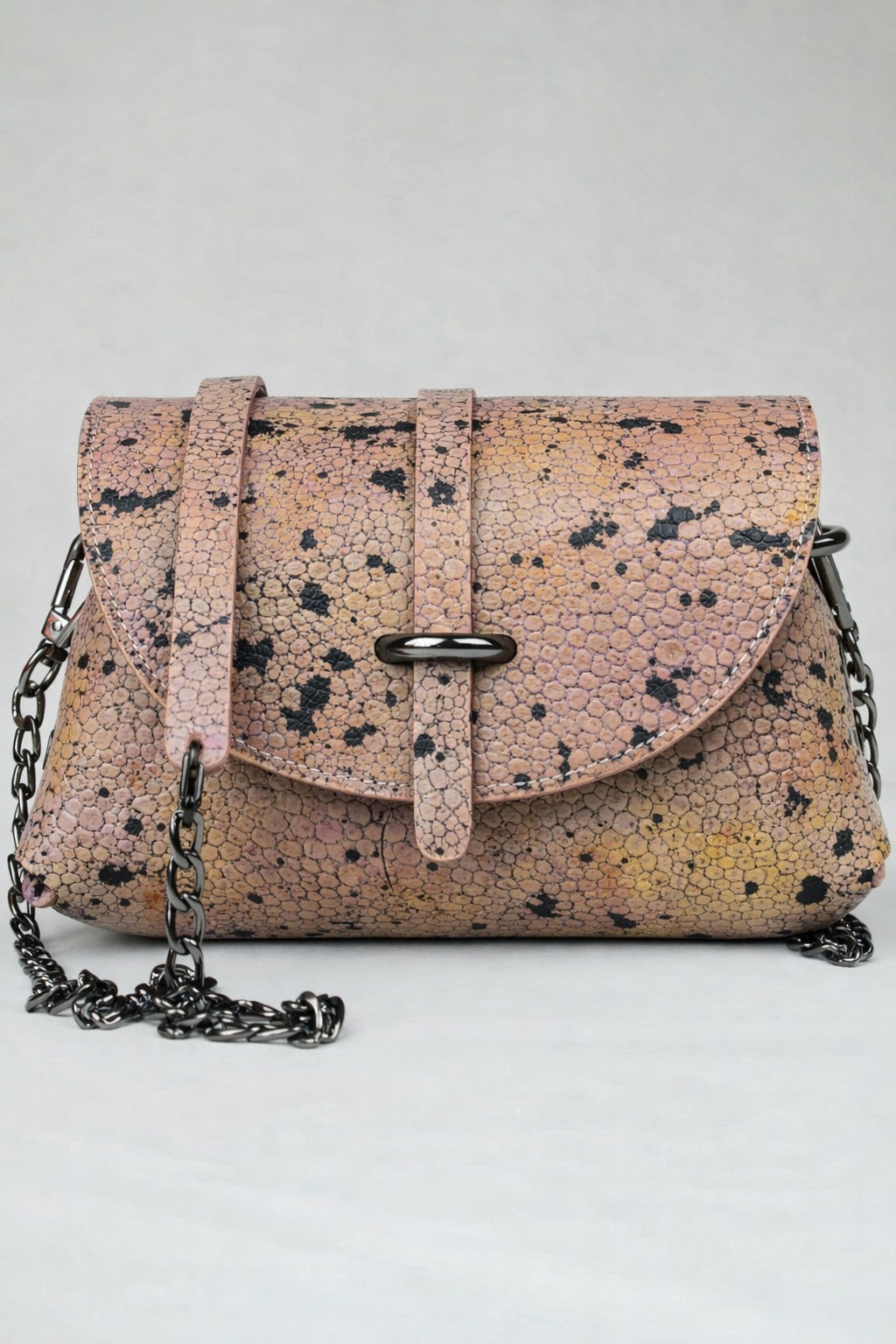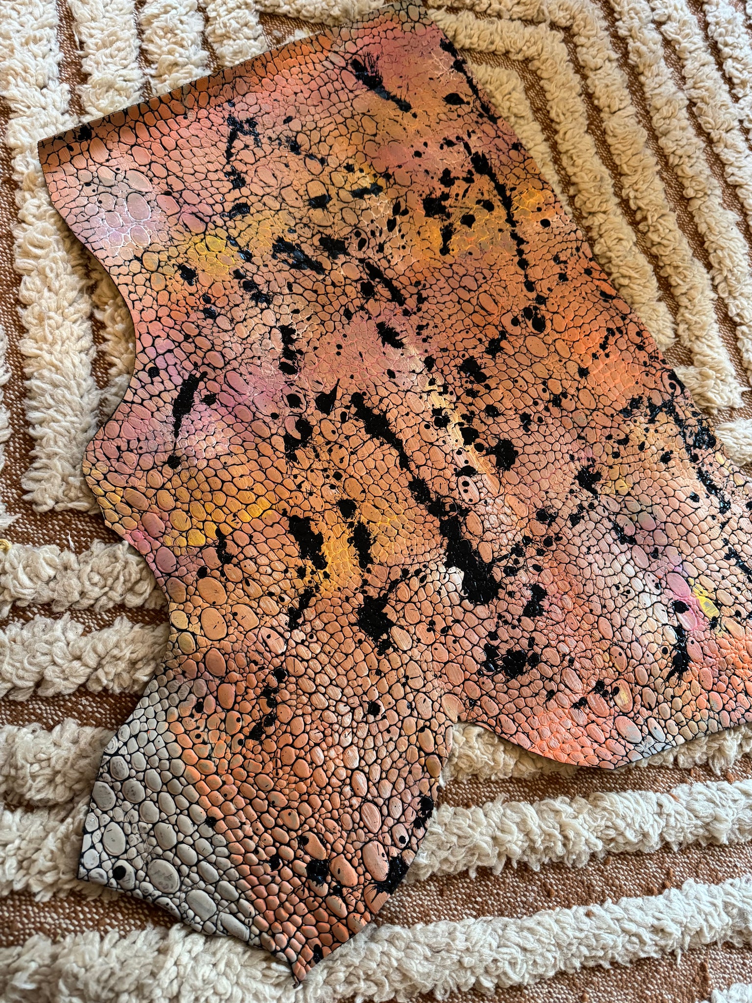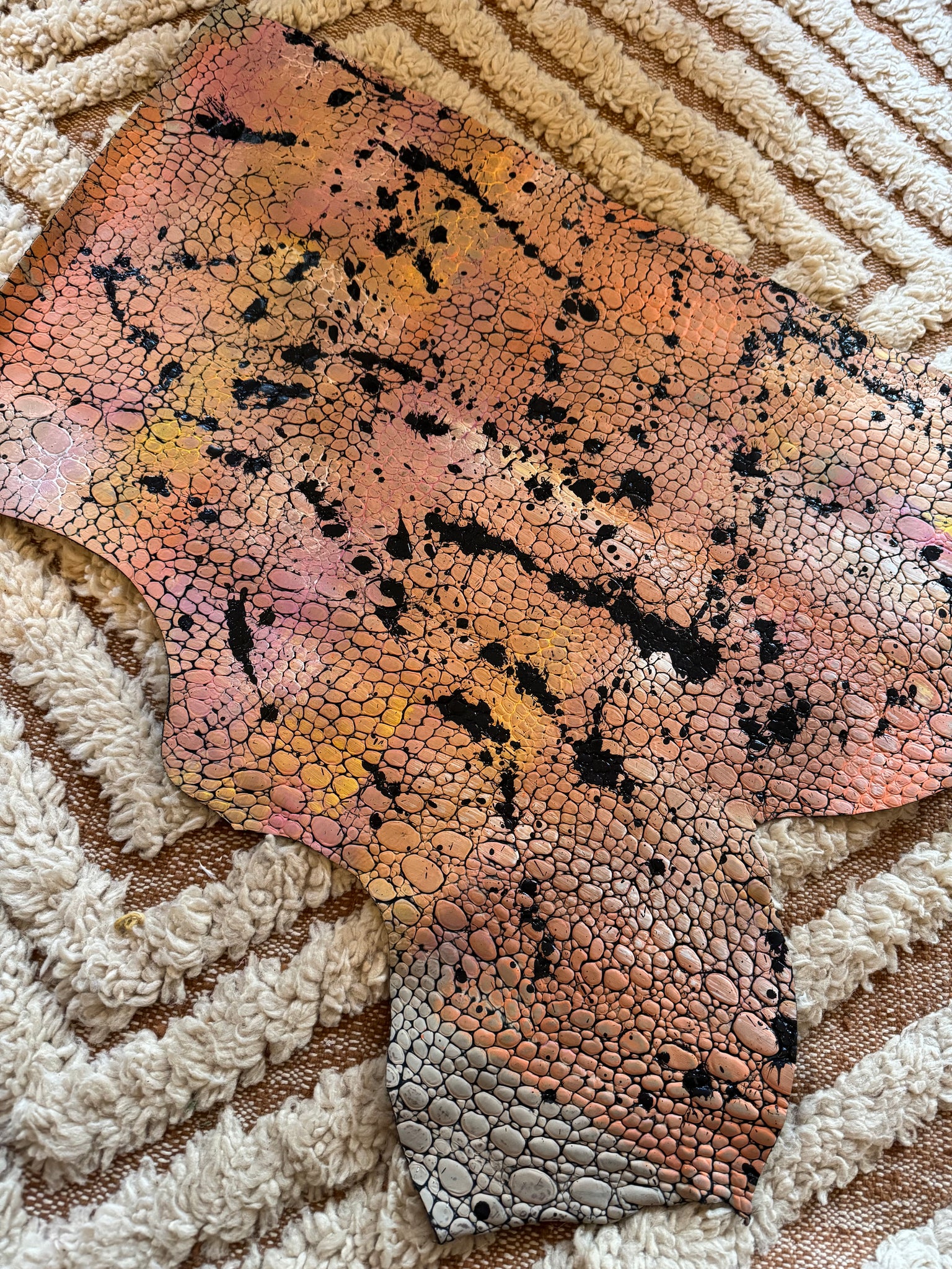 En cuir de veau façon croco, tout en relief gauffré , entièrement peint à la main