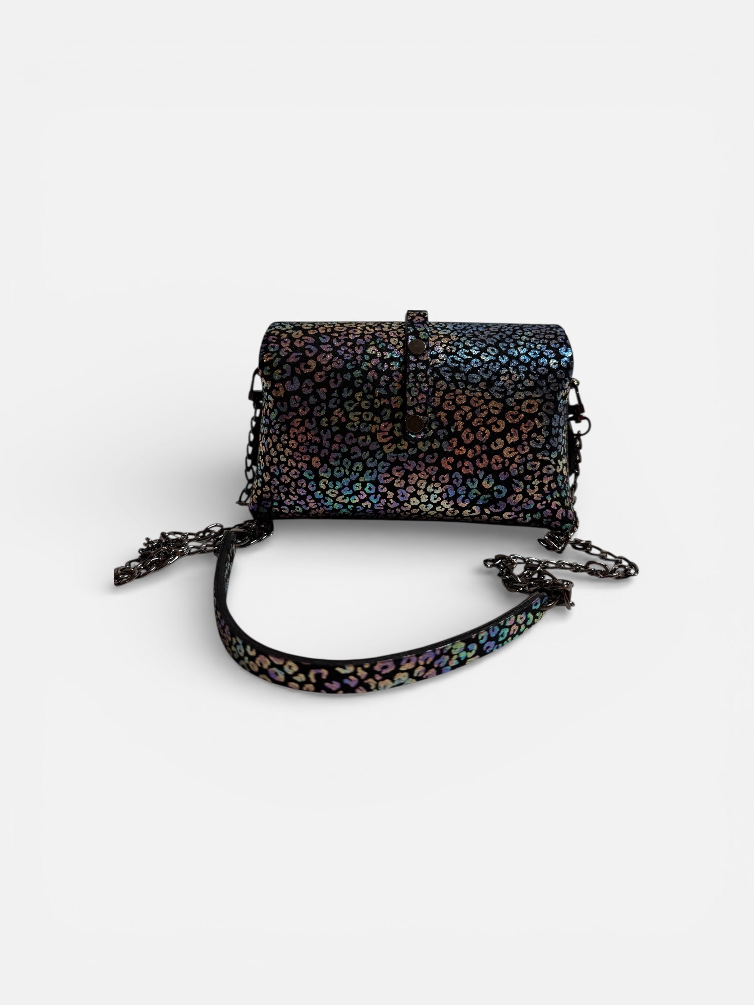 Made of Italian leather, holographic suede calfskin, black background