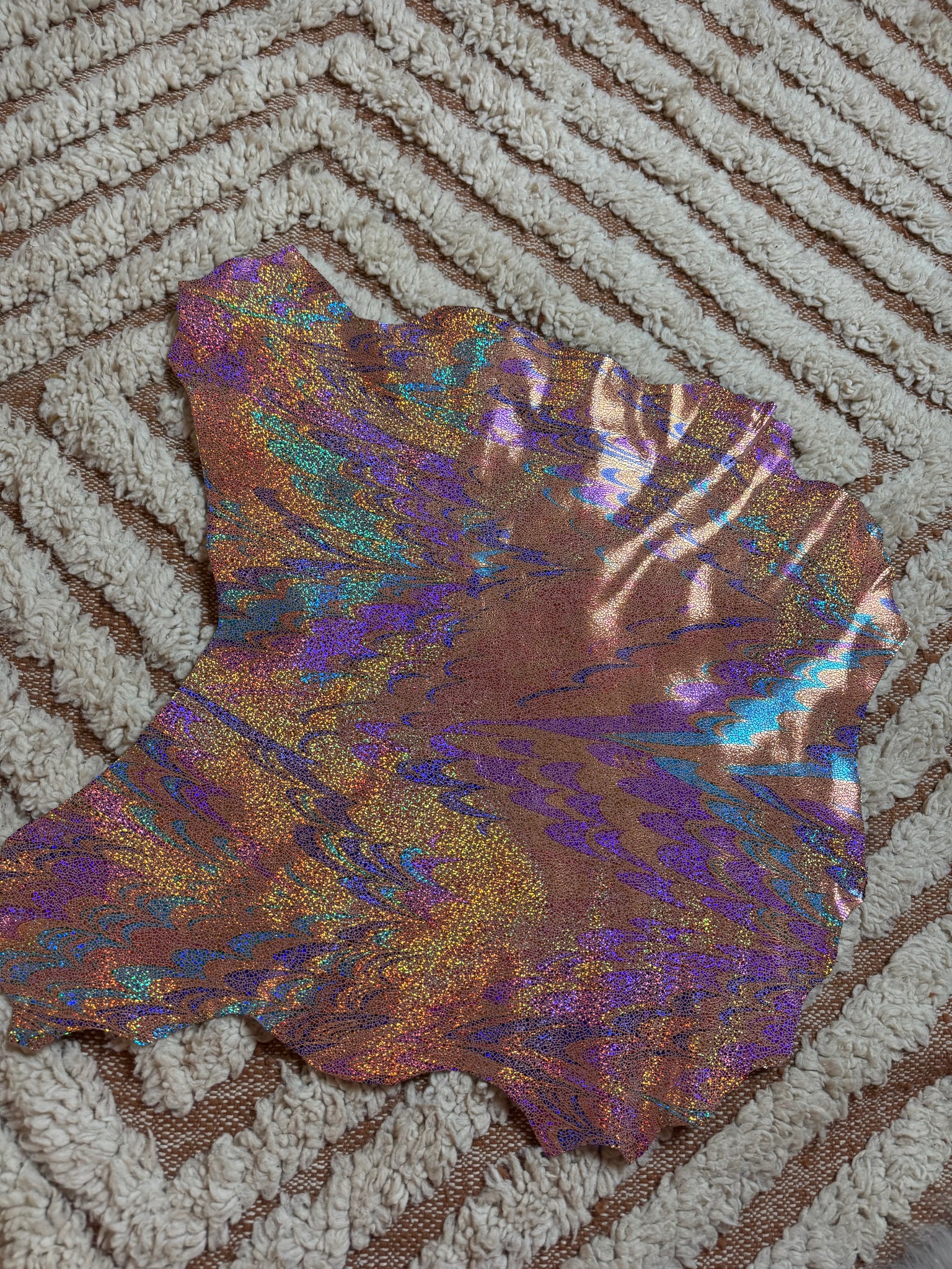 En cuir laminé imprimé holographique , multi colore , esprit boule à facettes , brillant irisé , effet pailleté , par endroit comme un effet plume de paons .