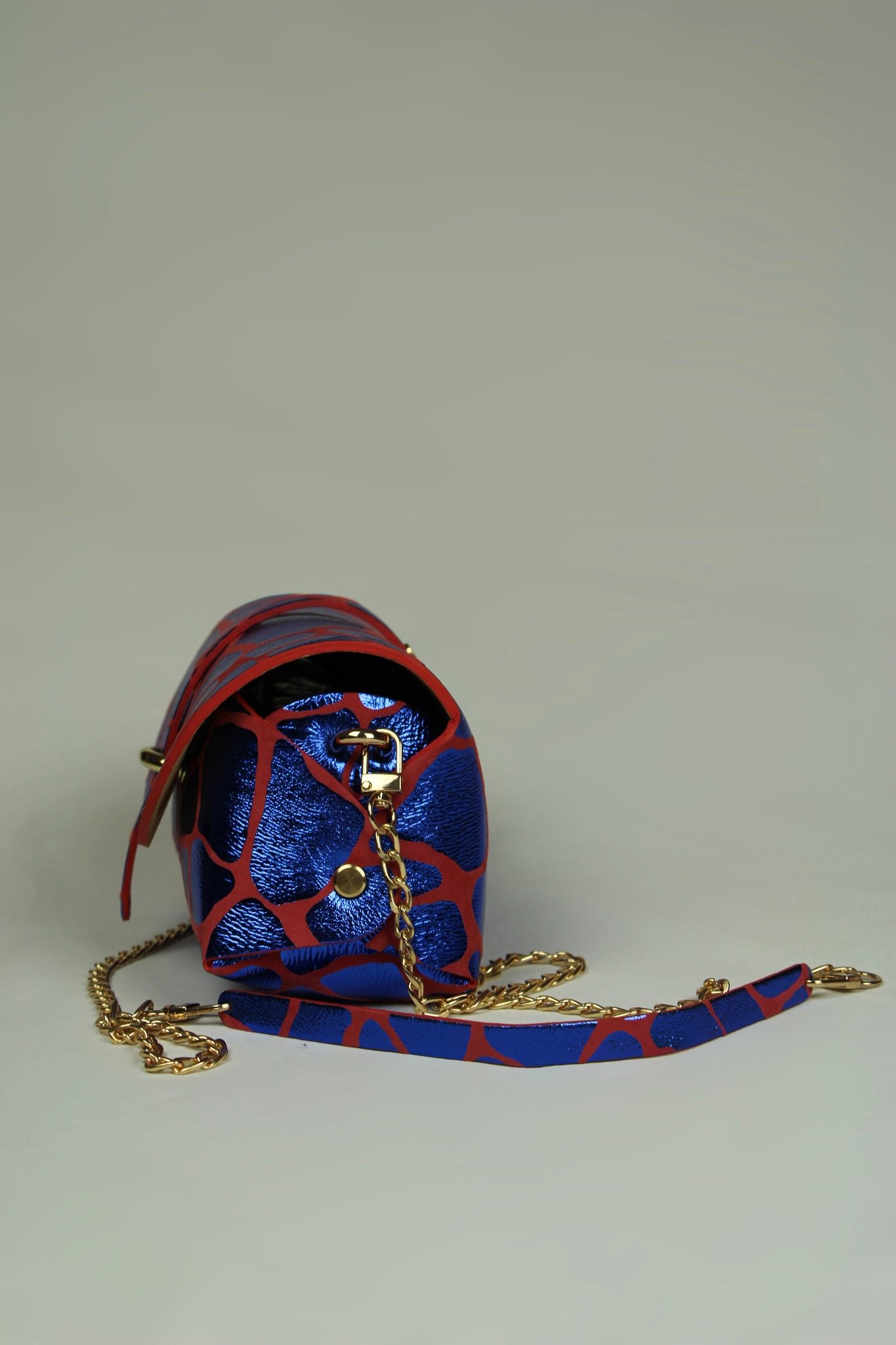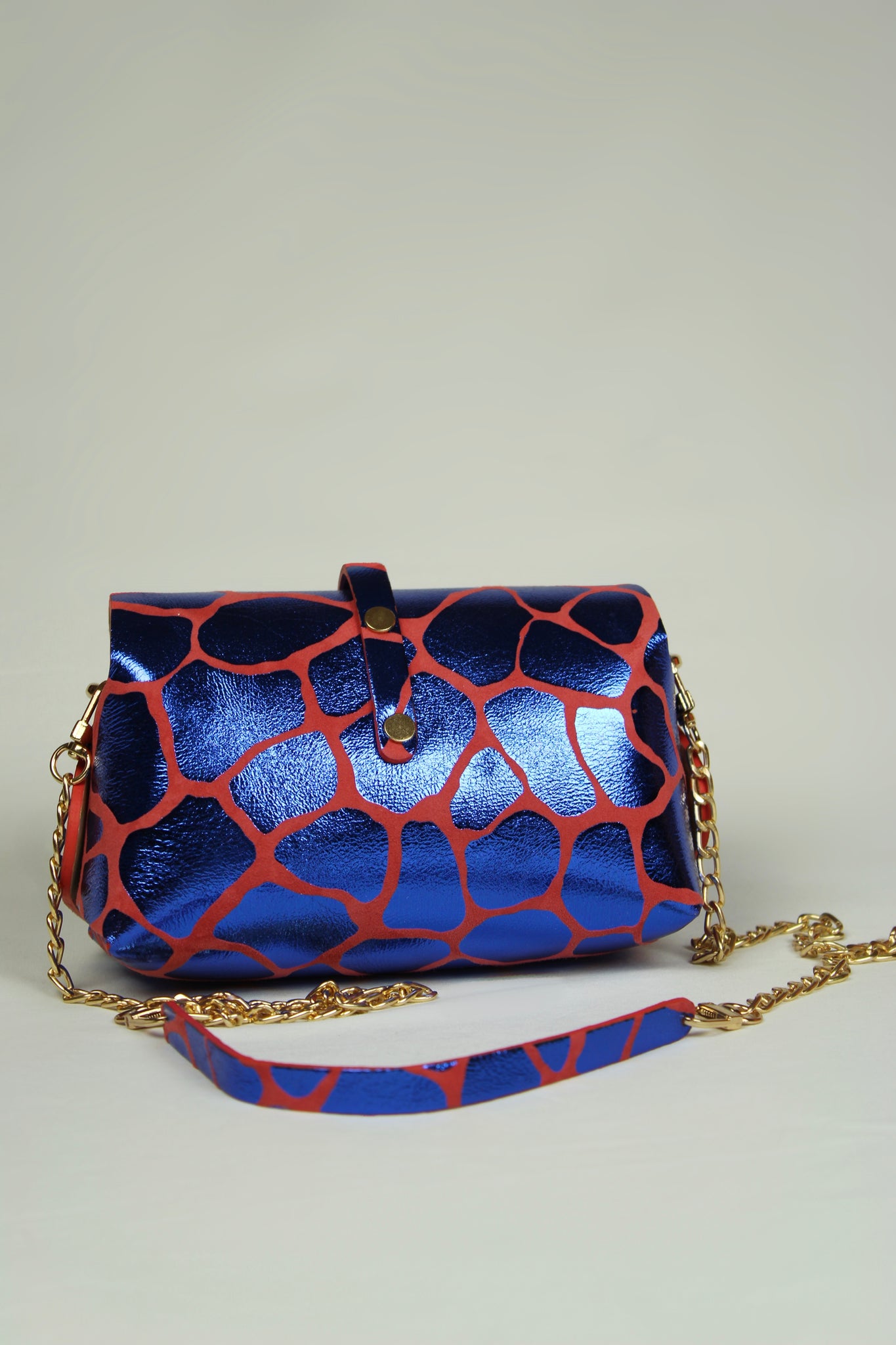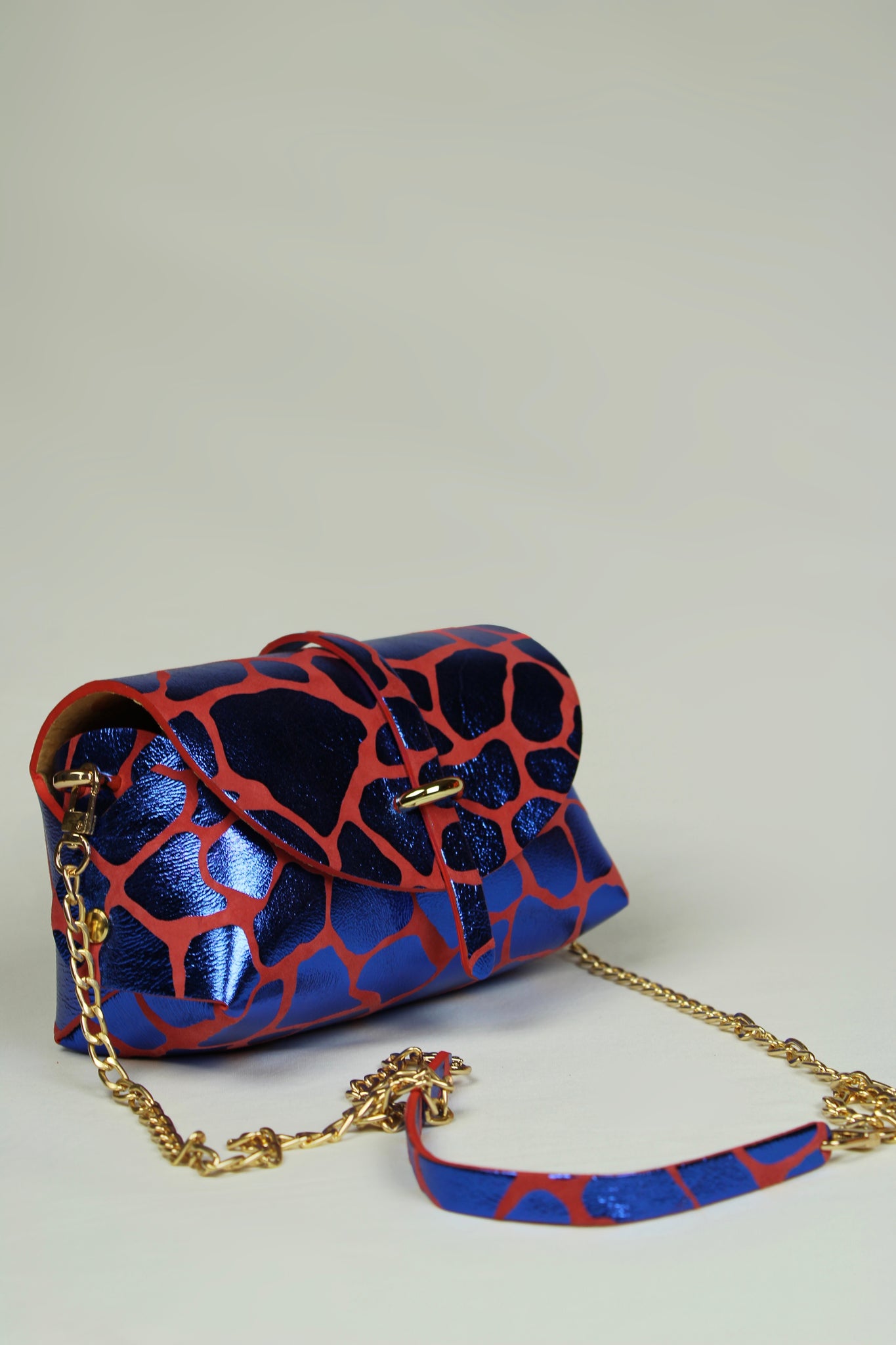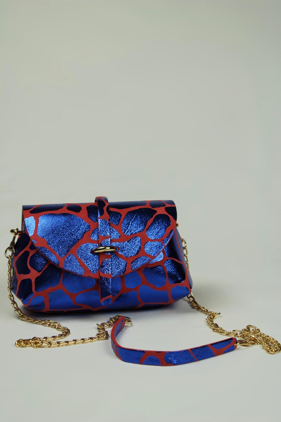 En cuir laminé imprimé girafe bleu , cuir de chèvre métallisé sur base en daim rouge