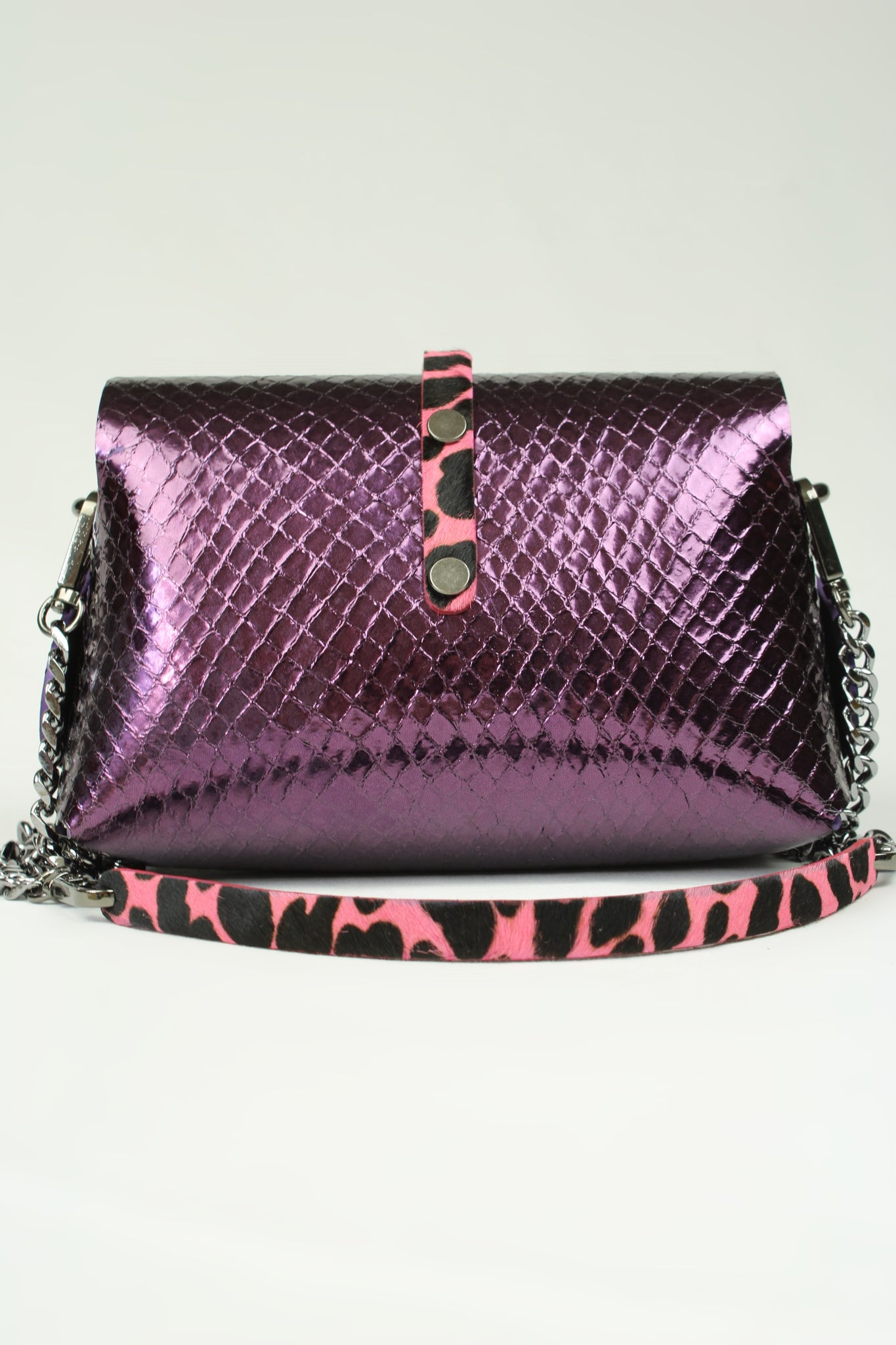En cuir Italien serpent teinté couleur aubergine et cuir de veau , languette en cuir de veau , texture façon poney , fond noir imprimé léopard rose .