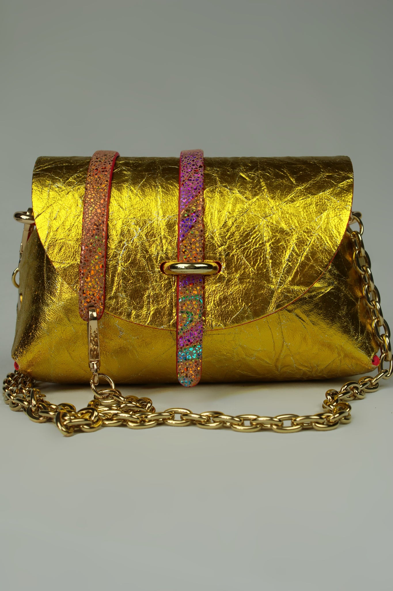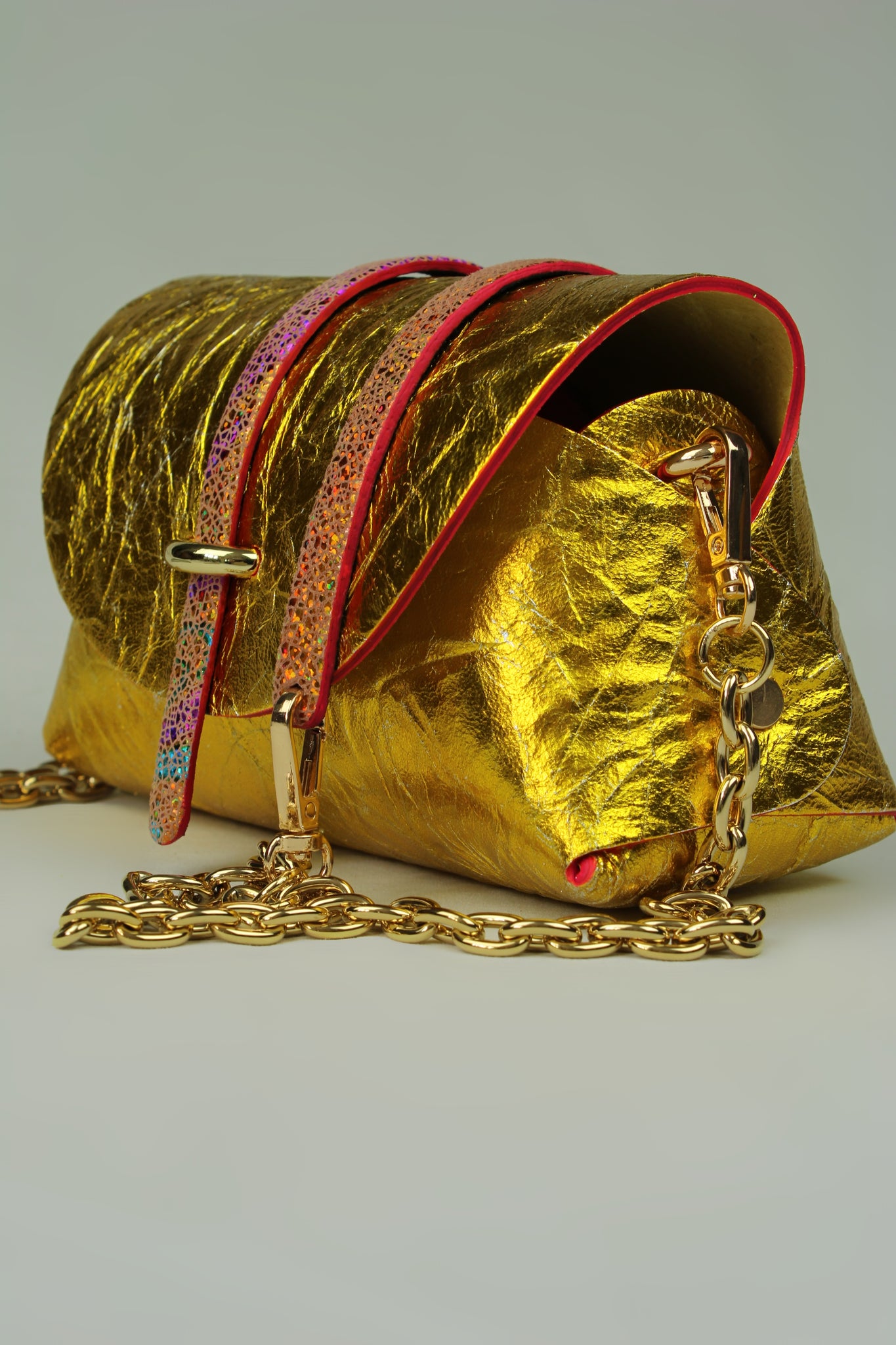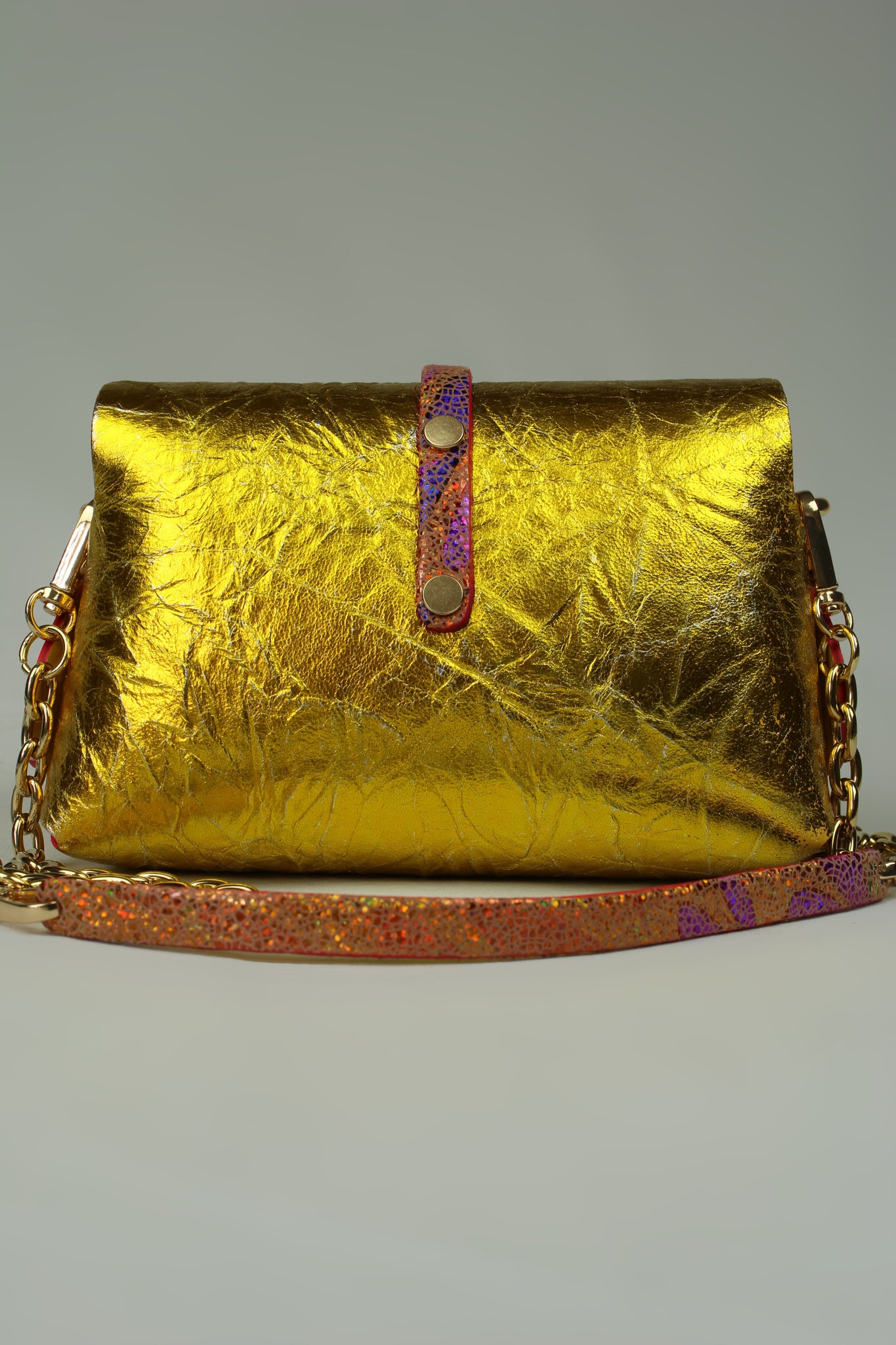 En cuir laminé vintage , recouvert de papier feuille d’or , très précieux , languette en cuir holographique .