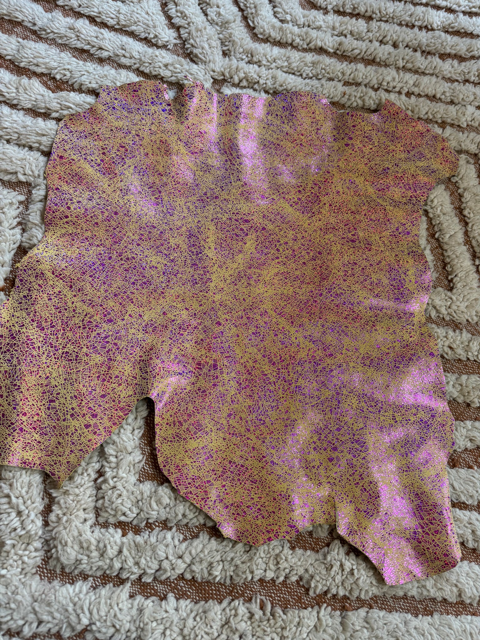 En cuir laminé imprimé multicolore , cuir de chèvre métallisé sur base en suedine jaune , couleur grenat , framboise, doré