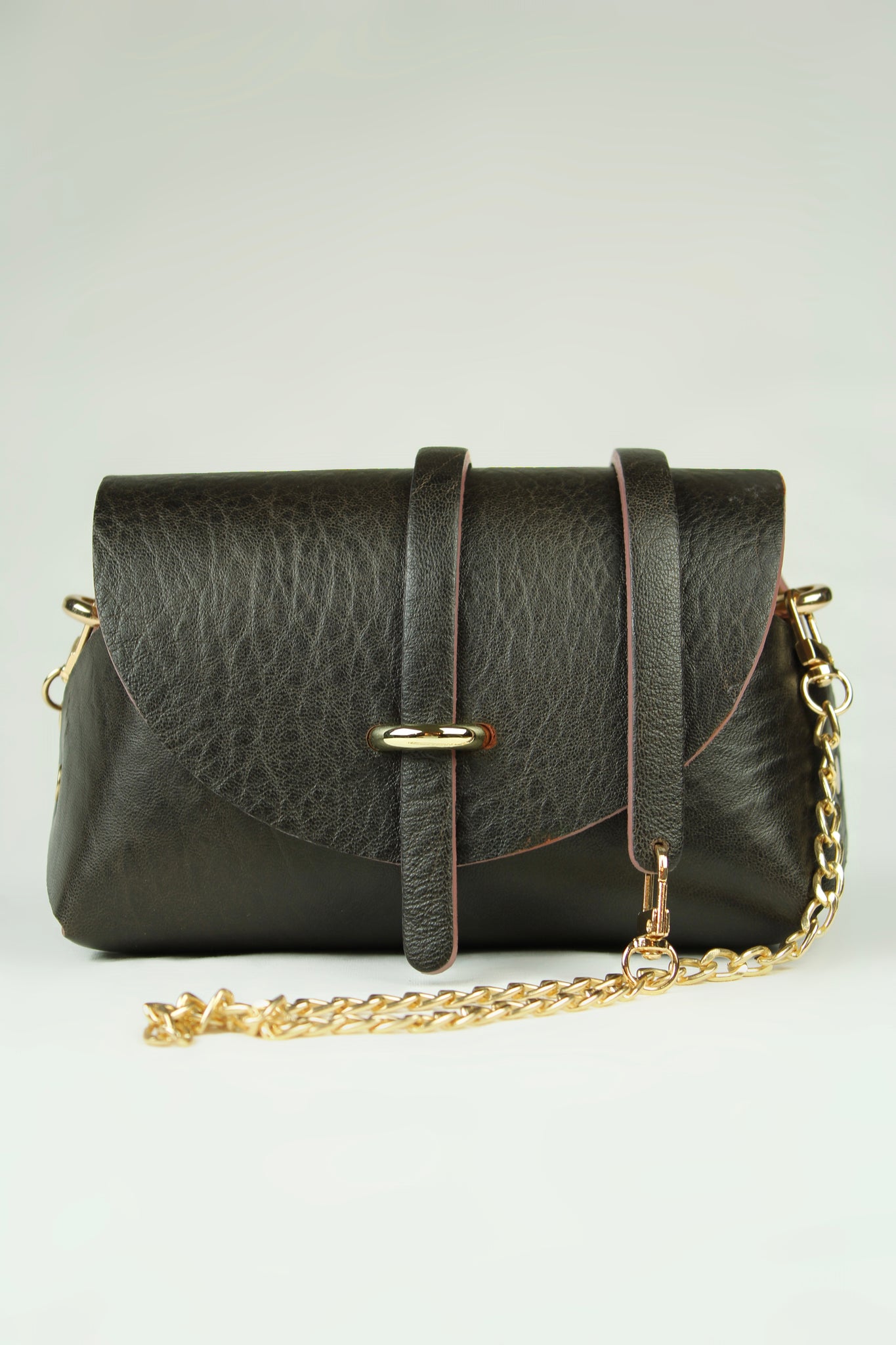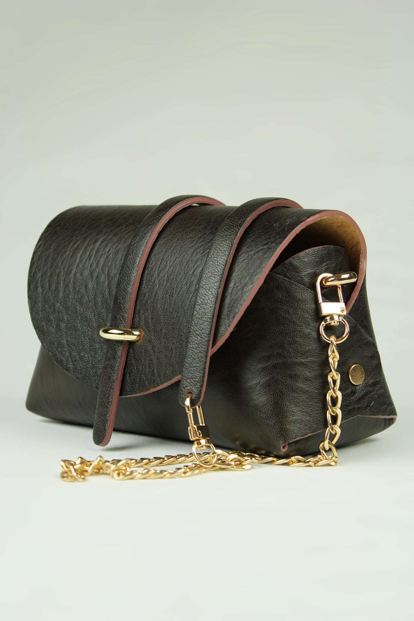 Ce sac se ferme avec une lanière en cuir passant dans une attache en métal doré