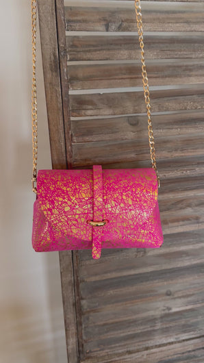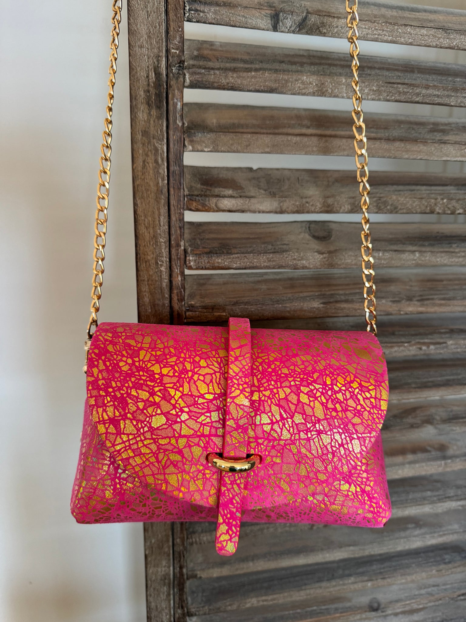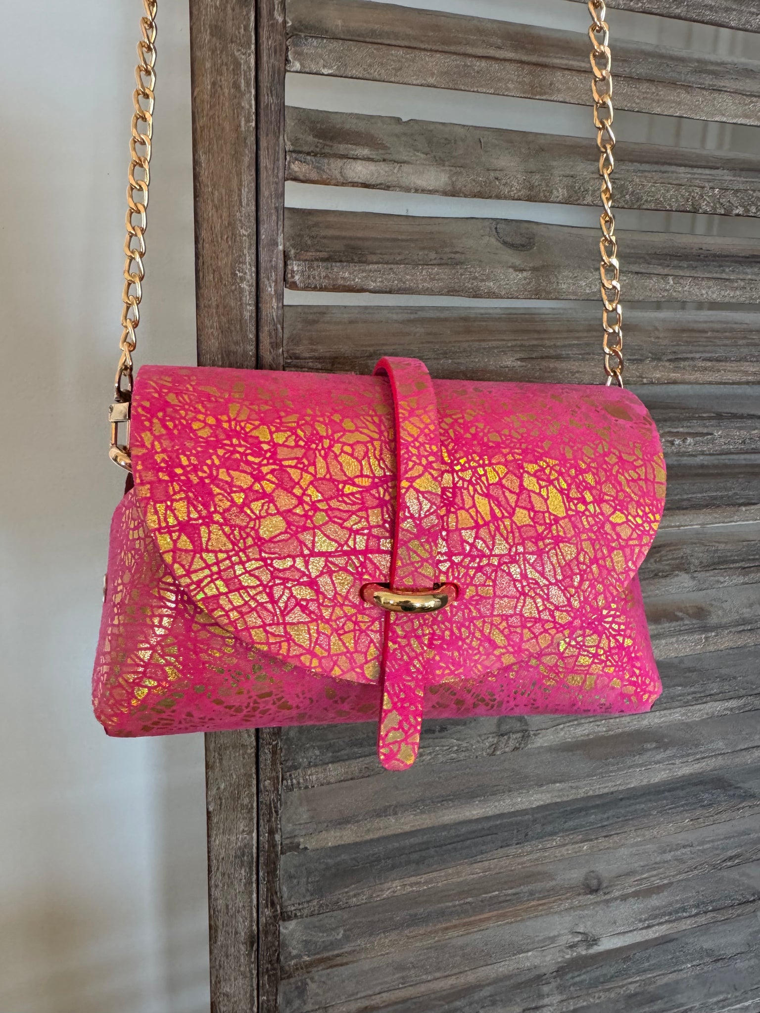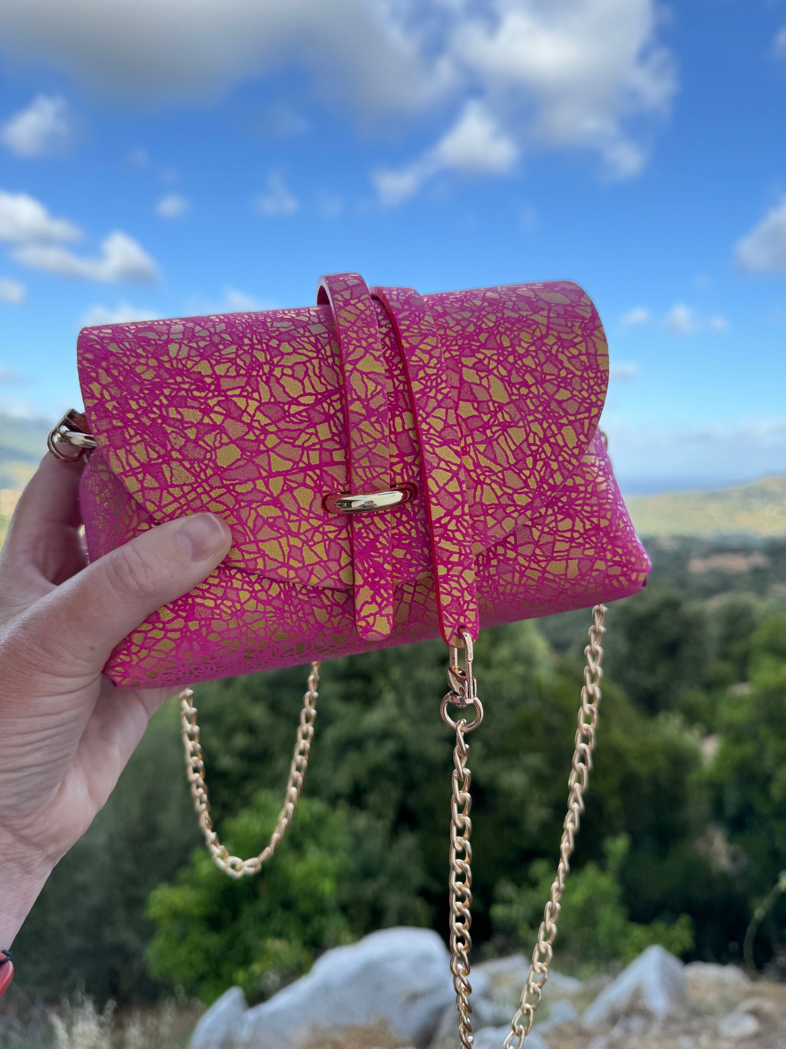 Voici notre nouveau Drop ! Cette beauté de sac Bee est tout en cuir , un cuir version terrazzo or fond rose fushia , couleur vitaminée , solaire , couleur qui vous donne la pêche et le sourire du matin au soir ! Il est d’un chic fou et absolu ! Il est canon ! Chaîne dorée ! Tellement chic ! C’est une bombe atomique et nous en sommes très fières ! J’espère que vous aurez envie de le porter à votre tour et de l’adopter et qu’il fera parti de vos indispensables ! Il est unique !