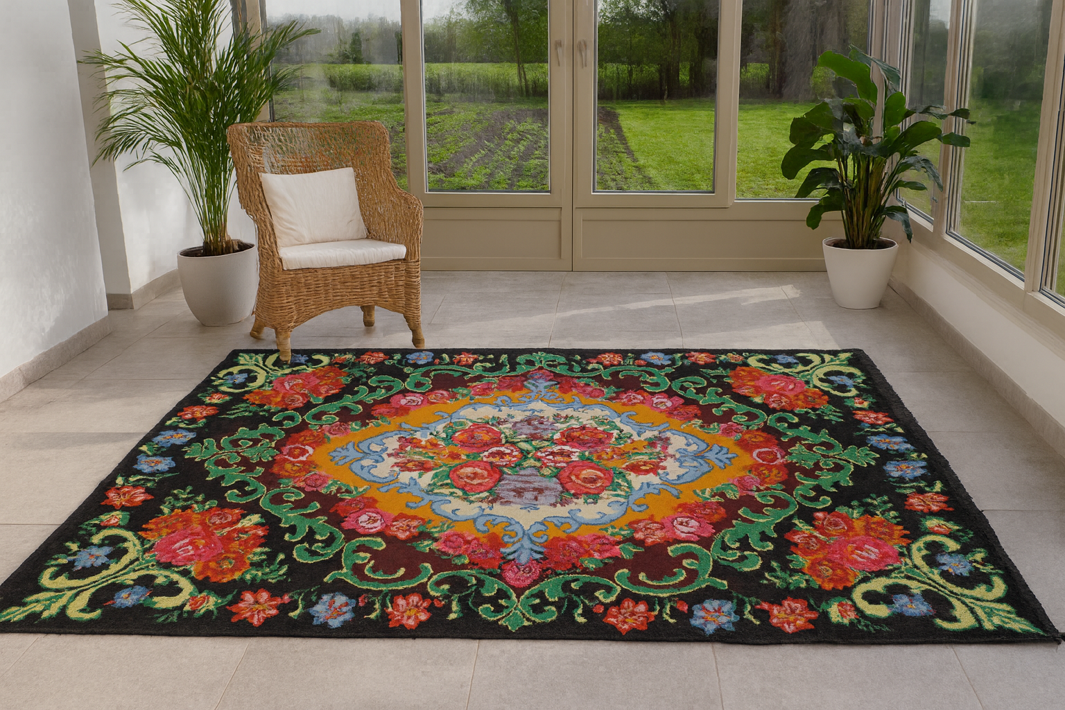 Pièce remarquable de notre nouvelle sélection de tapis moldaves vintage, tissée à la main dans les années 1980. Ce modèle authentique séduit par ses couleurs franches et ses motifs floraux éclatants, typiques de l’artisanat moldave d’avant la chute du mur de Berlin.